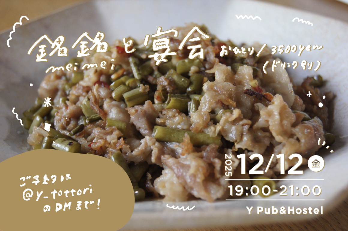 Yのパブスペースでは、これまで飲食イベントを通じて“食”を介したコミュニケーションを実践してきました。今回は、各地でケータリングを行い料理を振る舞う「銘銘(meimei)」をお迎えし、ビュッフェスタイルの宴会を開きします。